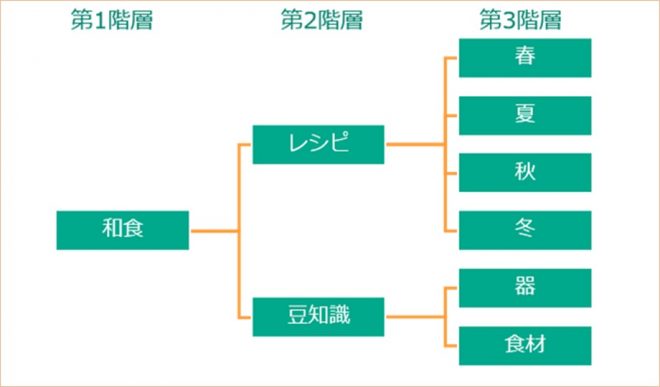 上記図のように、カテゴリーは親となる1階層目の下に、2階層、3階層と追加することができます。しかし、1万ページ以上の大規模サイトでなければ、あっても2階層あれば十分。
