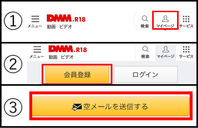 画像の手順(FANZAへアクセス・会員登録をタップ・空メールを送信)で、入力したメアドに登録完了のメールが届きます。