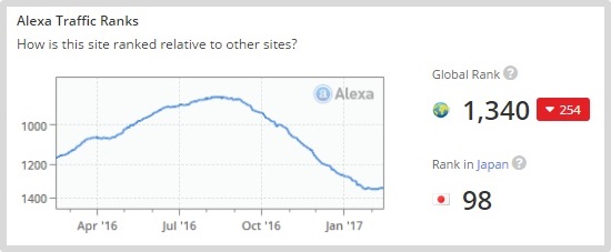 どれぐらい影響力があるサイトなのかというと、世界にあるサイト(ジャンル問わず)をアクセス順にランキングしているAmazonの子会社「Alexa」では、なんと世界1,340位、日本で98位という位置にいます。
