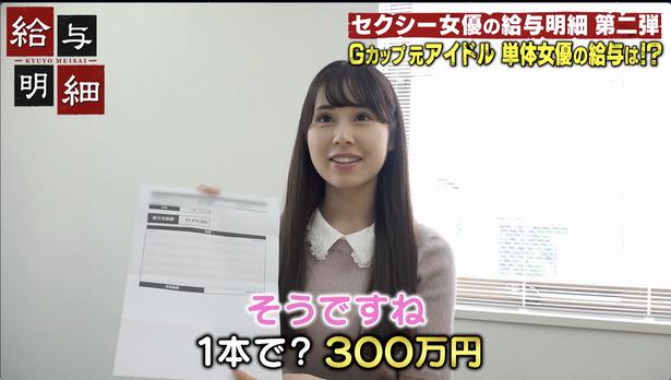 AbemaTVの番組「給与明細」で、AVの出演料が1本300万円ということを公表しています。単体女優の出演料は1本あたり50万円~100万円が基本なので、出演料が300万円というのはかなり凄いです。
