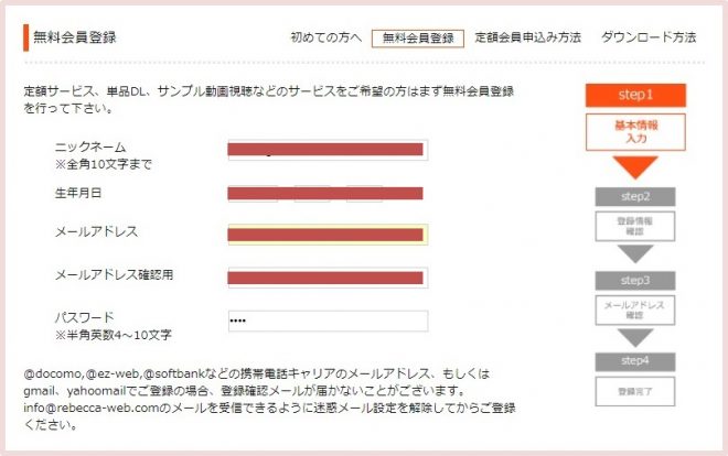無料会員登録ページに「ニックネーム・生年月日・メールアドレス・PASS」を入力し、利用規約を出来るだけ読み、「登録情報確認へ」をクリック。すると、入力したメアドに本登録用のURLが記載したメールが届きます。